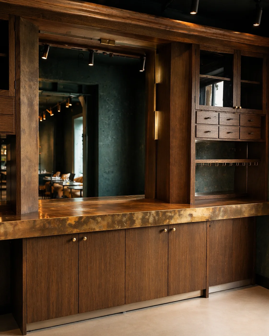 A substantial bar counter in dark walnut with aged brass surfaces — commercial joinery made to the same standard as the residential work.