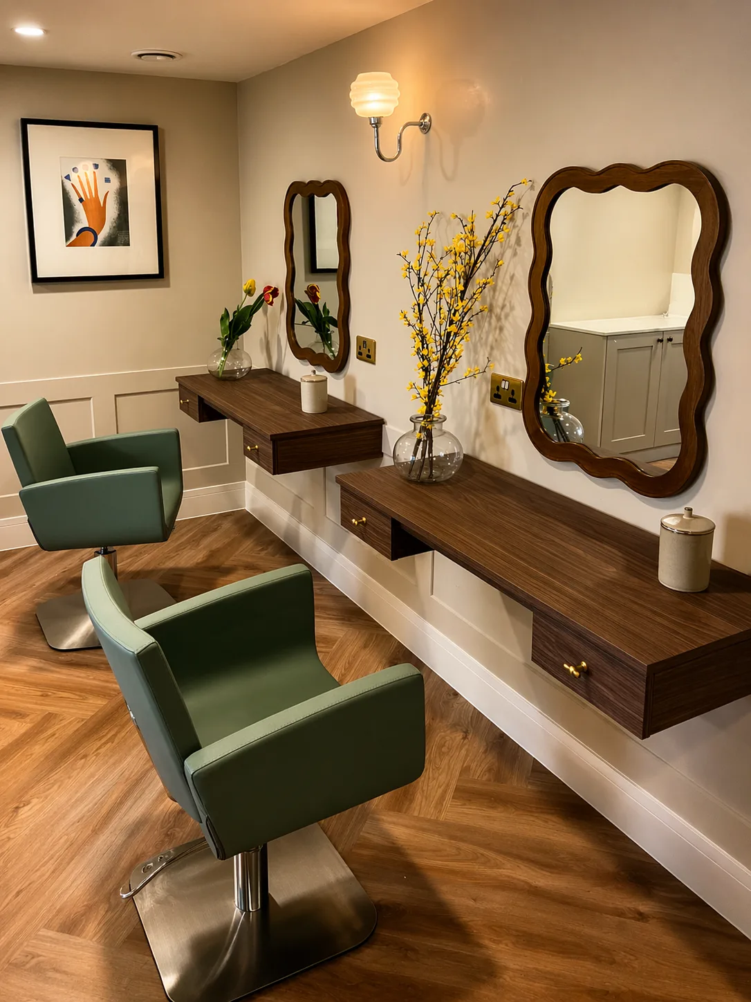 Bespoke floating dressing stations in walnut with integrated drawer runs, made for a specialist salon interior.